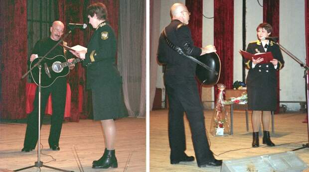 Хочу показать, как я выходила на сцену. Букет цветов, женщина в форме… Он, конечно, был очарован! Ну, и поскольку это был творческий вечер, меня попросили придумать какие-то слова, и я посвятила Розенбауму стихи.