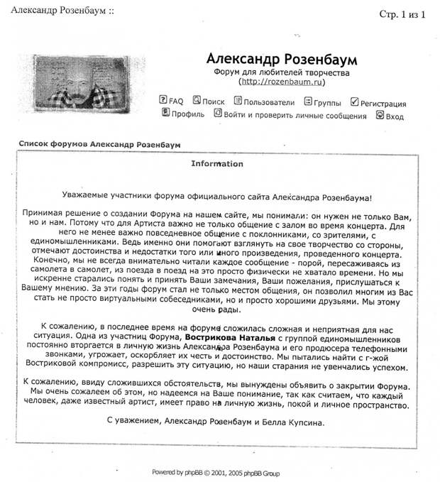 А когда моя влюбленность начала достигать пика, произошла неприятная история: нас поссорили. Произошла провокация, во главе которой стояла его продюсер: меня обвинили в том, что я вторгаюсь в жизнь артиста! Мол, им поступают угрозы, и Розенбауму было четко объяснено, что это от меня. Как результат, Александр Яковлевич закрывает форум, и наши фраеровки прекращаются.
