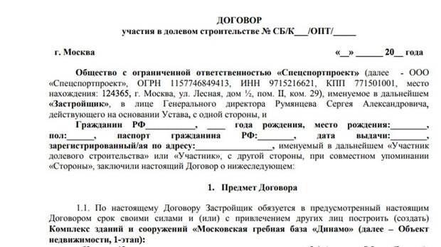 Daily Storm среди документов обнаружил бланк договора между застройщиком «СпецСпортПроект» и участником долевого строительства, потенциальным покупателем апартаментов.