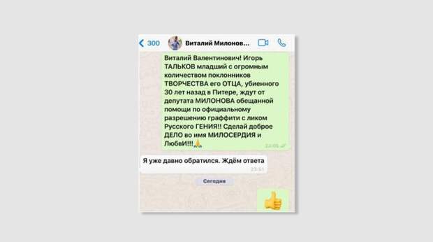 «Виталий Валентинович! — попросил актер. — Игорь Тальков — младший с огромным количеством поклонников творчества его отца, убиенного 30 лет назад в Питере, ждут от Милонова обещанной помощи по официальному разрешению граффити с ликом русского гения! Сделай доброе дело во имя милосердия и любви!»