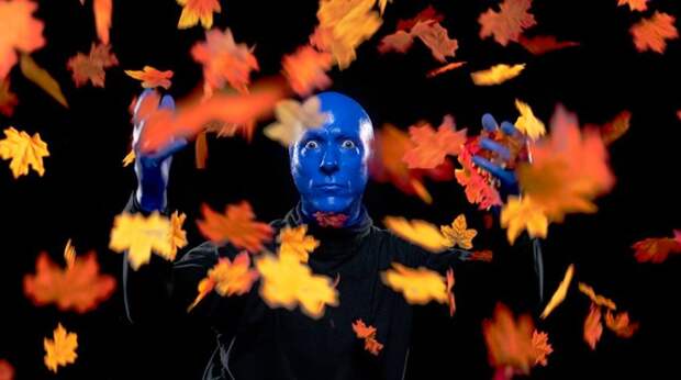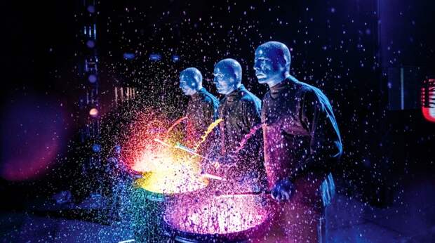 Трое артистов, по макушку замазанные синим гримом, начали с места в карьер с самого фотогеничного своего номера — игры на барабанах цвета. При каждом ударе от мембран разлетались брызги краски — сразу стало понятно, зачем на зрителях в партере дождевики.