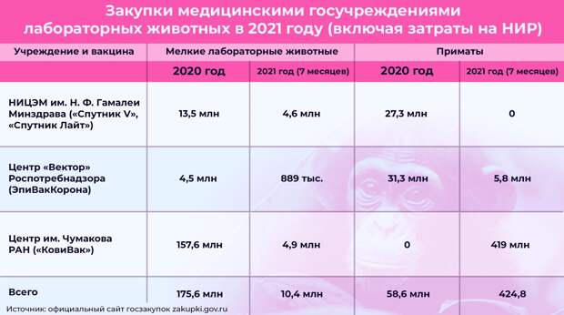 Всего в 2020 году Центр имени Гамалеи (разработчик «Спутник V») потратил на мелких лабораторных животных 13,5 миллиона рублей, на приматов — 27,3 миллиона рублей, включая расходы на проведение НИР усилиями других организаций. В 2021 году на приобретение грызунов центр направил 4,6 миллиона рублей. Организация не заказывала обезьян за границей, обходясь поставками из НИИ медицинской приматологии в Сочи, где за последние два года они закупили 18 макак: мощности научного учреждения на юге страны ограничены.