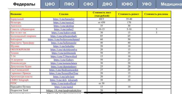 Список каналов, которые можно использовать для размещения, большой, так же, как и расценки. Daily Storm получил документ с примерной стоимостью постинга в крупных федеральных каналах.