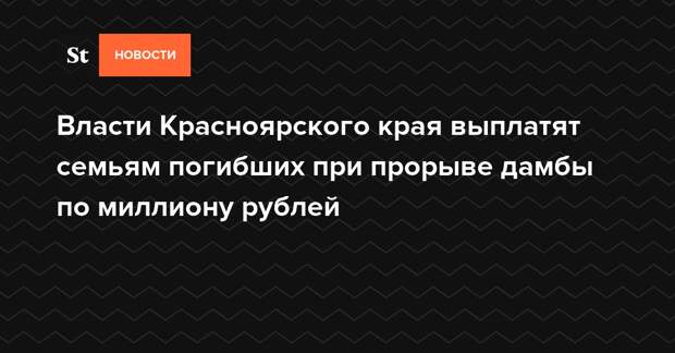 Семьям погибших при прорыве дамбы в районе поселка Щетинкино в Красноярском крае выплатят по одному миллиону рублей. Об этом рассказала министр соцполитики края Ирина Пастухова. Также она сообщила, что пострадавшие получат материальную помощь в размере от 50 тысяч до 500 тысяч рублей, в зависимости от причиненного здоровью вреда.