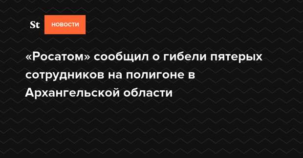 Еще три человека пострадали от взрыва.«В результате происшествия на военном полигоне в Архангельской области при испытании жидкостной реактивной двигательной установки погибли пять сотрудников Госкорпорации «Росатом». Еще трое наших коллег получили травмы и ожоги различной степени тяжести. Трагедия произошла в период работ, связанных с инженерно-техническим сопровождением изотопных источников питания на жидкостной двигательной установке», — говорится в сообщении госкорпорации.