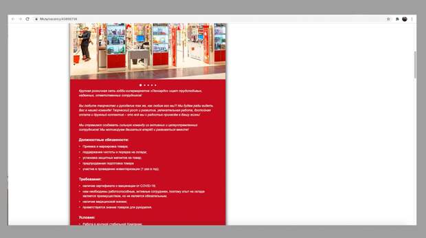 В Челябинске «Гамма» нанимает сотрудника на позицию маркировщика. В его обязанности не входит прямое общение с покупателями, однако от кандидата все равно требуется справка о прививке от коронавируса, следует из объявления на сайте hh.ru, опубликованного 19 июня.