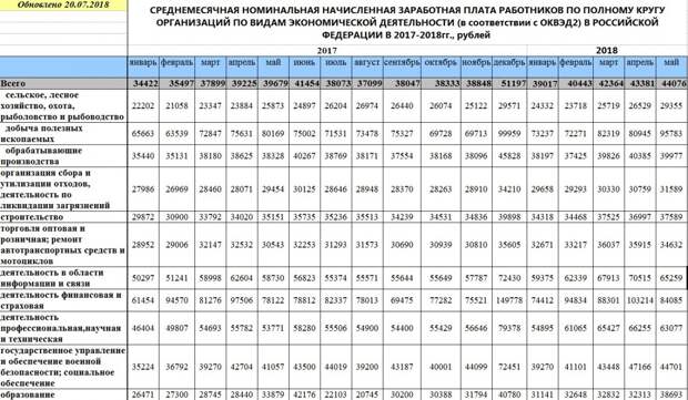 По видам экономической деятельности наибольший рост начисленной заработной платы зафиксирован в добыче полезных ископаемых, где за май 2018 года Росстат приводит цифру в 95 783 рубля. Наименьший рост показало сельское и лесное хозяйство — 29 355 рублей.