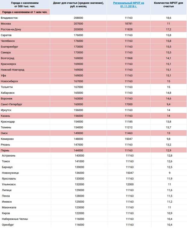 Жителям столицы Приморского края, для того чтобы чувствовать себя счастливыми, нужно в месяц получать около 208 тысяч рублей, говорится в исследовании сервиса. На втором месте рейтинга расположилась Москва, для счастья столичным жителям требуется 207 тысяч рублей. Третье место в опросе занял Ростов-на-Дону, жители которого заявили, что будут счастливы, если их заработная плата будет составлять 203 тысячи рублей.