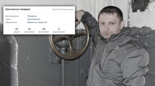 Следующий — Константин Назаров. Житель Наро-Фоминска. В профиле указана жена и пятилетняя дочь Алиса. Мужчина окончил Краснодарское высшее военное авиационное училище летчиков (КВВАУЛ имени Серова) по направлению «военно-транспортная авиация». Подписок у летчика немного: детский сад №9, где, предположительно, училась его дочь, новости Наро-Фоминска и две группы, связанные с подмосковным Звенигородом.