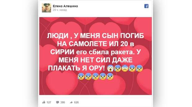 О другом погибшем военном — подполковника Алексее Алешине — сообщила в Facebook его мать Елена. Несколько часов в Сети провисело ее сообщение: «Люди, у меня сын погиб на самолете Ил-20 в Сирии. Его сбила ракета. У меня нет сил даже плакать. Я ору!» Спустя несколько часов публикация была удалена.