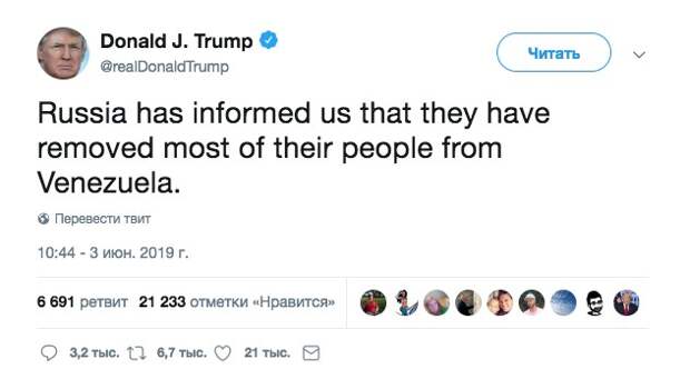 «Россия информировала нас, что они вывели большую часть своих людей из Венесуэлы», - написал 3 июня Трамп. О ком именно идет речь, президент не уточнил. Однако днем ранее газета Wall Street Journal со ссылкой на источник, близкий к Минобороны РФ, написала о том, что российские военные специалисты начали покидать Венесуэлу.