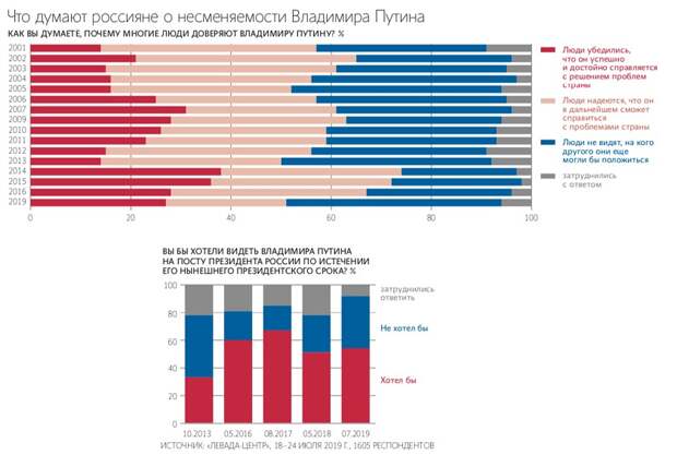 Глава исследовательской организации Лев Гудков считает, что в обществе стали воспринимать Путина не как лидера, определяющего процесс, а как рутинную фигуру, не способную улучшить ситуацию.Оставить Владимира Путина на посту президента России и после 2024 года желают 54% опрошенных социологами, пишут «Ведомости». Максимальным этот показатель был в августе 2017 года – 67%. Рекордной стала доля тех, кто затруднился с ответом – 8%, прежде она составляла от 14 до 26%. Максимума с июля 2001 года достигла доля россиян, доверяющих Путину, поскольку они не видят, на кого еще могли бы положиться. Так ответили 43% респондентов против 29% в 2016 году.