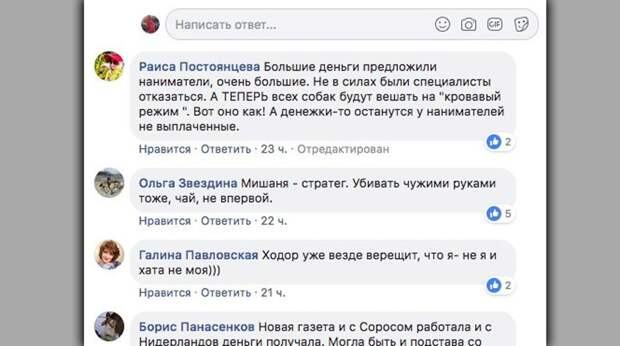И пока в день трагического известия журналистское сообщество в России и общественность выражали соболезнования, вспоминали погибших ребят и пытались понять, кто понесет ответственность за случившееся, инвестор ЦУРа отмалчивался. Лишь ближе к ночи Михаил Ходорковский опубликовал в Сети соболезнования и подтвердил, что ребята работали совместно с его «проектом «Центр управления расследованиями» (главный редактор — Андрей Коняхин) над расследованием «Российские наемники». Впрочем, пользователей Facebook и многочисленных Telegram-каналов эта позиция не удовлетворила, и в Сети стали появляться посты на тему того, что «журналистов в ЦАР убил Михаил Ходорковский».