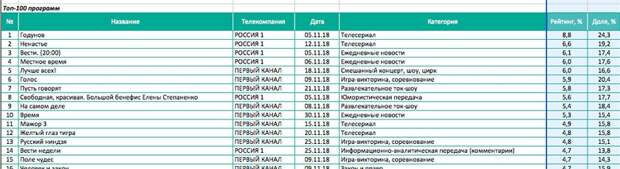 Еще страшнее выглядит составленный по нашей просьбе Топ-100 ноябрьских программ. Место действия — вся Россия. Аудитория — от четырех лет. Для чистоты эксперимента выбраны три главных канала страны — Первый, «Россия 1» и НТВ. И что бы вы думали, смотрят наши люди? Нет, не «Что? Где Когда?». Сериалы и ток-шоу, иногда отвлекаясь на концерты и новости. «Пусть говорят» с Дмитрием Борисовым уверенно расположилось на седьмой строчке, «Андрей Малахов. Прямой эфир» — на 21-й. При этом что-то действительно стоящее — например, простая и искренняя программа «Жди меня» — находится лишь в самом конце списка.