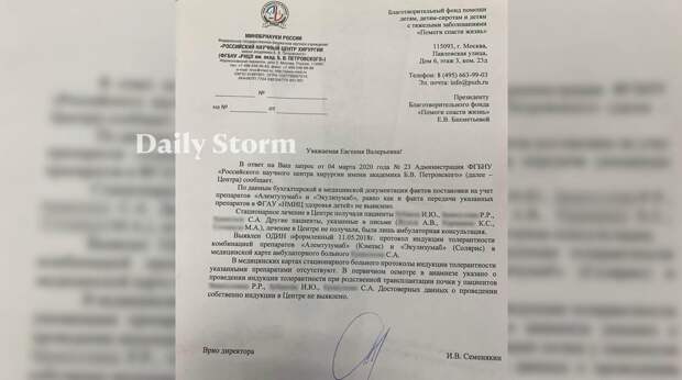 «По данным бухгалтерской и медицинской документации, фактов постановки на учет препаратов «Алемтузумаб» и «Экулизумаб»… не выявлено», — говорится в официальном ответе Игоря Семенякина — на тот момент исполняющего обязанности директора Научного центра хирургии имени Б.В. Петровского, где проводилась трансплантация у Вани.