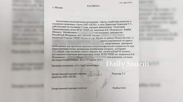 Согласно договору, Центр содействия взял на себя обязательство закупить необходимые лекарства в Европе и доставить их к операции, которая была запланирована в Российском научном центре хирургии имени академика Б.В. Петровского (РНЦХ). Спустя месяц поставщик отчитался распиской о том, что лекарства на сумму 2,7 миллиона рублей переданы в руки трансплантолога. Правда, в документе не указали ни наименования купленных препаратов, ни даже их количество. Гарантом передачи служили лишь две подписи — Михаила Каабака и директора АНО Татьяны Рыжковой.
