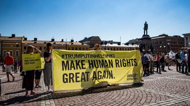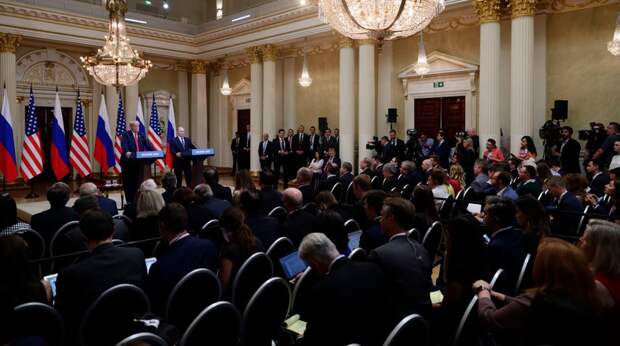 Зал для пресс-конференций в Хельсинки разделили на две части. С одной стороны стояли журналисты из России, с другой — сотрудники американских, европейских и других иностранных СМИ. Пресс-конференция долго не начиналась, из-за того что встреча Путина с Трампом затянулась на 40 минут. Журналистов то выгоняли из здания по автобусам, то просили вернуться обратно.