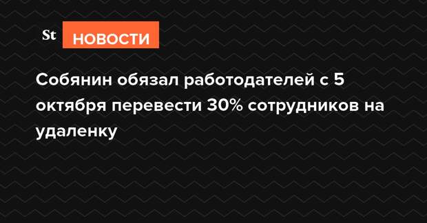 Власти Москвы попросили работодателей перевести на удаленку 30% сотрудников с 5 по 28 октября. Об этом сообщил мэр столицы Сергей Собянин. Согласно документа, на дистанционный режим работы следует перевести всех сотрудников старше 65 лет и страдающих хроническими заболеваниями.