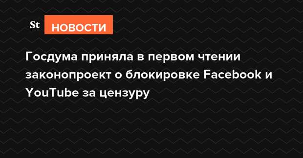 Госдума приняла в первом чтении законопроект, позволяющий Роскомнадзору блокировать интернет-ресурсы (включая YouTube, Facebook и Twitter) за цензуру российских СМИ. Согласно тексту документа, таким сайтам также будет присваиваться статус владельца ресурса, допускающего дискриминацию по отношению к материалам отечественных СМИ.