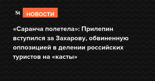 Писатель Захар Прилепил вступился за официального представителя МИД Марию Захарову, рассуждения которой о туризме оппозиция сочла как деление россиян на «касты». По мнению Прилепина, против Захаровой организована целая кампания, чтобы ее глава МИД Сергей Лавров «под воздействием «общественного мнения», подвинул куда-нибудь».