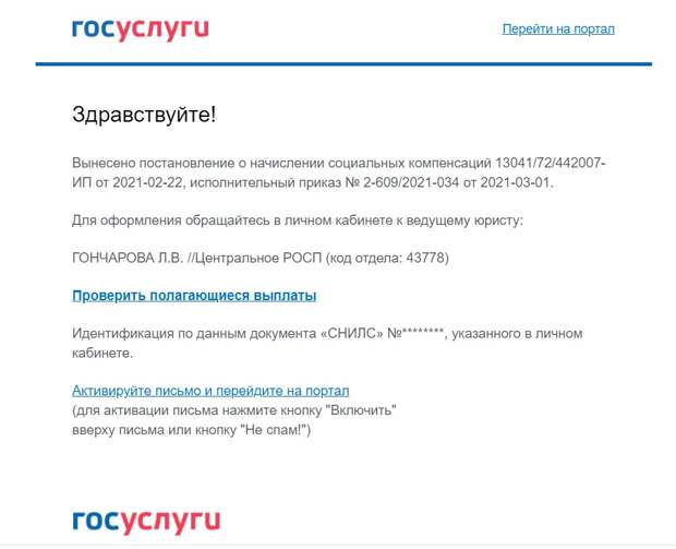 Письмо оформлено в стиле, характерном для портала «Госуслуги» — совпадают логотипы, шрифт и цвет гиперссылок. Получателю предлагается получить некие соцвыплаты, перейдя по ссылке в личный кабинет и обратившись к «ведущему юристу Гончаровой Л. В.», а также введя СНИЛС. При переходе по ссылке у пользователя также требуют номер банковской карты, якобы для перевода денег.