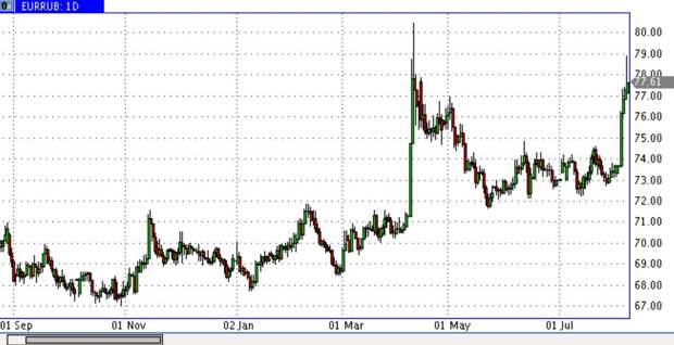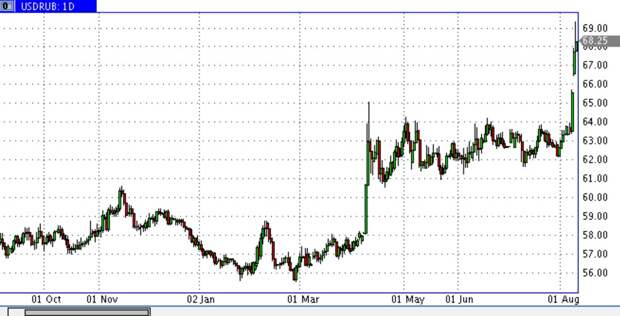 Во вторник, 7 августа, на закрытии торгов доллар стоил 63,5 рубля, 8 августа его курс уже превышал 65 рублей. В четверг падение рубля продолжилось: доллар пробил отметку в 66 рублей (уровень ноября 2016 года), а евро перешагнул за 77. Однако 10 августа евро, в отличие от доллара, подешевел и, по данным на 10:40 мск, торговался на уровне 76,4 — 76,5 рубля. По состоянию на 16:30 мск 10 августа курс доллара достигал отметки 67,67 рубля.