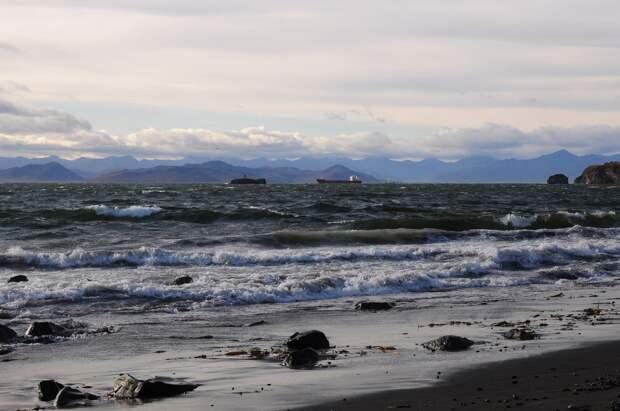 Ждем и мы. Но недолго. Минут через двадцать волна немного утихает, а в направлении Петропавловска-Камчатского устремляется средних размеров корабль. Если догнать его и сесть на хвост в метрах пятидесяти, то о шторме можно не волноваться: ведущее судно погасит все волны.