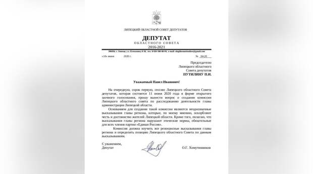 Депутат Липецкого областного совета Олег Хомутинников направил председателю регионального парламента письмо с просьбой создать комиссию по расследованию деятельности губернатора Липецкой области Игоря Артамонова. Об этом Хомутинников рассказал Daily Storm.