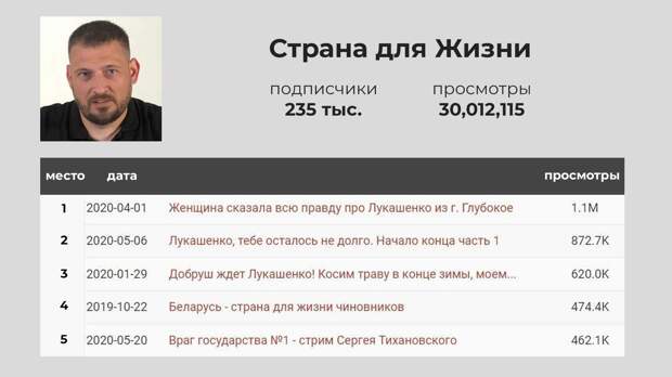 Три видеоролика из списка топ-5 наиболее популярных видео на канале посвящены Лукашенко. Еще одно видео — «Беларусь — страна для жизни чиновников» (470 тысяч просмотров) повествует о конкретных депутатах, которые на месте сельских детских садов, школ и оздоровительных центров для детей строили жилые дома: для собственного проживания или для извлечения выгоды аффилированными строительными компаниями. Факты из биографии чиновников перемежаются общением Тихановского с местными жителями. На пятом месте в топе — стрим Тихановского «Враг государства №1» (461 тысяча просмотров), записанный почти сразу после освобождения от первого, еще административного ареста, в котором он отвечал на вопросы зрителей стрима. Общее число просмотров на канале — 30 миллионов.