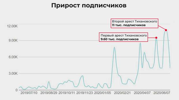 В отличие от видеоблога Николая Платошкина, где пиковый прирост подписчиков не был связан с арестом, у Тихановского ситуация прямо противоположная. Наибольший приток подписчиков (11 тысяч) на YouTube-канал «Страна для жизни» был зафиксирован 29 мая, сразу после задержания Сергея Тихановского. Второй по величине прирост подписчиков (9,6 тысячи) произошел после первого ареста — в самом начале мая.