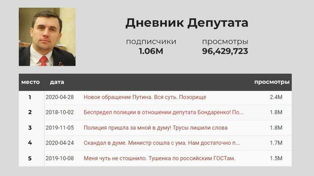 Наибольший прирост подписчиков (74 тысячи) на видеоблог «Дневник депутата» был зафиксирован 30 апреля — спустя два дня после видео «Новое обращение Путина» (первое место в топе популярных). Чуть меньший приток пользователей (66 тысяч) произошел после публикации видео «Скандал в Думе. Министр сошла с ума» (четвертое место в топе популярных), в котором Бондаренко в язвительной манере вещал: