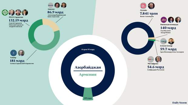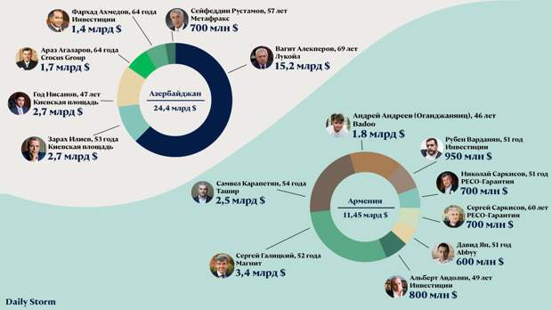 Российские миллиардеры армянского и азербайджанского происхождения оказались втянуты в конфликт в Нагорном Карабахе: одни бизнесмены просят помощи у Путина, другие — финансируют военных. Для многих из них Россия — вторая родина. Их компании добывают нефть, предпринимателям принадлежат сети продуктовых магазинов, ТЦ и автодилерские центры. Daily Storm подсчитал, сколько компаний из рейтинга Forbes принадлежит представителям диаспор, и выяснил, у кого денег больше — у азербайджанцев или у армян.