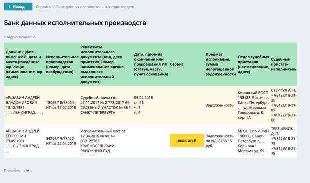 На сайте Федеральной службы судебных приставов отмечается, что у Андрея Аршавина есть две задолженности. Одна из них — 6158 рублей. Размер второй не указан.