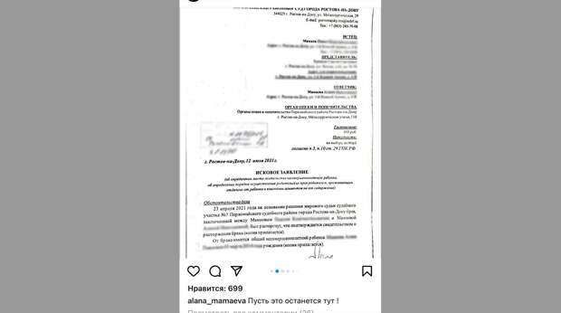 При этом адрес прописки господина Мамаева, указанный в документе, вызывает вопросы. Согласно материалам, футболист зарегистрирован не в жилом доме, а в кафе «Махаон». Адвокат Аланы убежден: это могло быть сделано, чтобы перенести судебное заседание в ростовский суд. Мамаева в свою очередь живет в Москве, в «маленькой квартире на 48 метров».