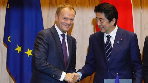 Председатель Евросовета Дональд Туск, председатель Еврокомиссии Жан-Клод Юнкер и премьер-министр Японии Синдзо Абе подписали в Токио соглашение о свободной торговле. Договоренность предполагает ликвидацию 99% существующих таможенных пошлин между экономиками Евросоюза и Японии.