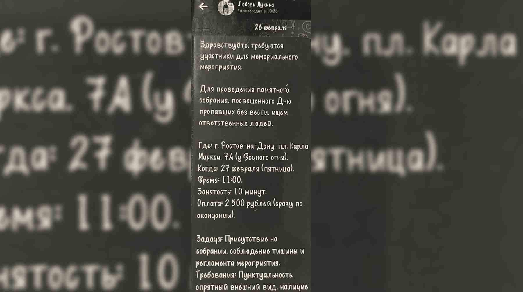 Занятость обещали минимальную — около десяти минут, а вознаграждение составляло 2,5 тысячи рублей. Примечательно, что среди обязательных требований организаторы указывали пунктуальность и опрятный внешний вид.