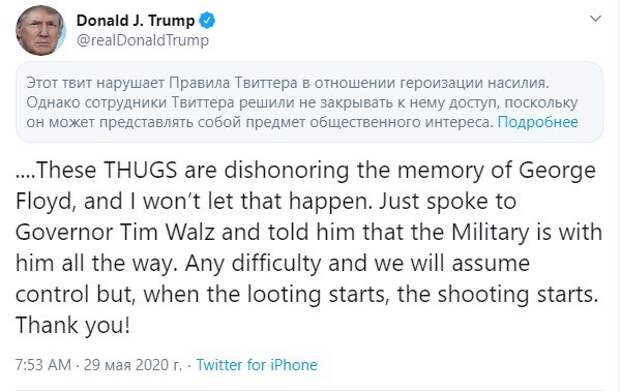 Администраторы Twitter разместили над постом президента США Дональда Трампа, где он угрожает взять ситуацию в Миннеаполисе под контроль с помощью Нацгвардии, плашку с предупреждением о нарушении правил соцсети в отношении «героизации насилия».