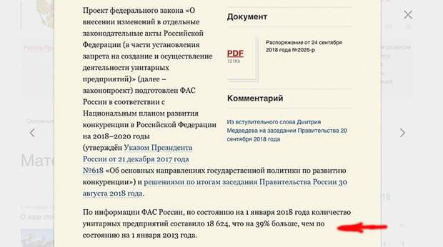 Интересно, что, жонглируя цифрами, ФАС забыла упомянуть, что по состоянию на 1 января 2016 года ГУПов и МУПов в стране действовало почти на четыре тысячи больше, чем сегодня, – 23 262 штуки. Именно такие данные приводила сама антимонопольная служба в январе 2018 года в своей пояснительной записке к законопроекту. Видимо, сокращение унитарных предприятий на одну пятую от общего числа для ФАС оказалось мало, и служба решила вовсе от них избавиться.