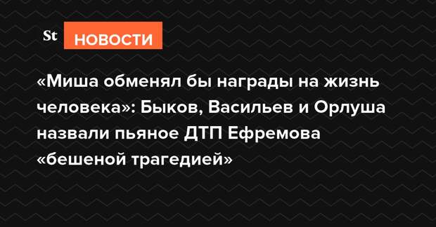 Авария в Москве с участием актера Михаила Ефремова, в которой погиб человек, является «дикой и бешеной историей». Ее не загладить никакими регалиями и наградами артиста. Об этом заявили коллеги Ефремова по проекту «Гражданин поэт» продюсер Андрей Васильев, писатель Дмитрий Быков и Орлуша.