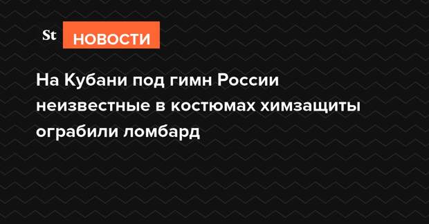Неизвестные грабители в костюмах химзащиты ограбили ломбард «Золотая Орхидея» в Белореченске (Краснодарский край). Во время нападения злоумышленники включили гимн России. В результате инцидента пострадали две сотрудницы учреждения (на опубликованной в соцсетях видеозаписи видно лишь одну женщину), которым обожгло лицо из-за слезоточивого газа. Инцидент произошел менее, чем за минуту, сумма ущерба не раскрывается.