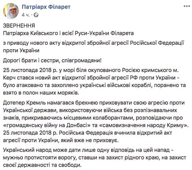 Патриарх Филарет, с которого в середине октября Константинопольский патриархат снял анафему, написал на своей странице в Facebook 26 ноября, что расценивает вооруженное столкновение экипажей украинских и российских кораблей 25 ноября в районе Керченского пролива как акт «открытой вооруженной агрессии» со стороны России.