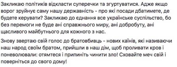 «Украинский народ может дать лишь один ответ на это нападение — мужественно противостоять врагу, встав на защиту родного края… Призываю к единению все украинское общество, потому что без победы не будет ни настоящего мира, ни благосостояния, ни счастливого будущего для каждого из нас», — написал предстоятель УПЦ КП.