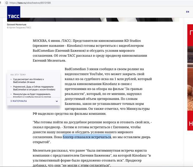 «Я брал информацию непосредственно с ТАСС, и там написано, что компания Kinodanz заявила, что они получили отказ от меня на личную встречу, на мировое соглашение, но «оставили дверь открытой». И эта информация, которая говорится от лица компании Kinodanz, — это наглая ложь! Вот цитата: «блогер отказался встречаться». Это наглая ложь со стороны Евгения Мелентьева», — рассказал Daily Storm Евгений Баженов.