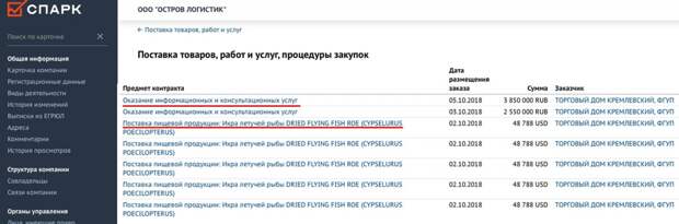 В семи госконтрактах торгового дома «Кремлевский» документов по закупке икры практически нет. По наличию протокола о результатах некоторых закупок можно узнать лишь то, что принято решение о заключении договора с ООО «Остров Логистик» на следующих условиях: цена одного контракта составляет 48 788 долларов, количество поставляемого товара — 105 упаковок, а срок исполнения — до декабря 2018 года.