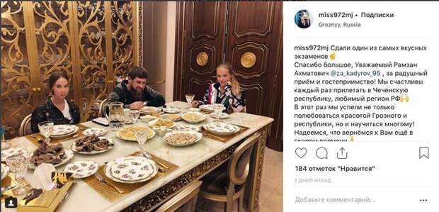 Тем не менее праздничные торжества закончились, вся политическая и не только элита разъехалась по домам, а Елизавета Пескова, известная своей любовью к Франции, вместе с подругой и по совместительству PR-директором Ярославой Манжес осталась еще на 10 дней в Чечне. За это время, как заверила «Шторм» Манжес, 20-летняя Елизавета научилась готовить традиционные для чеченской кухни блюда: жижиг-галнаш, чепалгаш, хинглаш и далнаш. И судя по Instagram-страничке Ярославы Манжес, экспертом и экзаменатором кулинарных способностей юной Песковой выступил сам глава Чечни Рамзан Кадыров. На одной из фотографий девушки изображены за столом в его резиденции, подпись: «Сдали один из самых вкусных экзаменов».