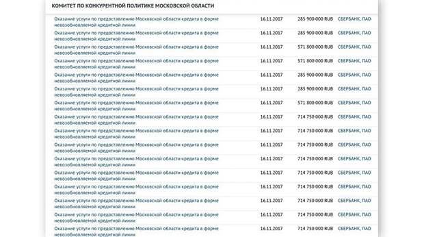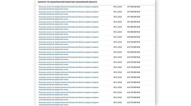 Комитет по конкурентной политике 9 ноября разместил на сайте госзакупок контракты на получение денежных займов. Суммы указываются разные: от 247 до 618 миллионов рублей. Всего размещено 20 таких лотов на общую сумму 10 395 000 000 рублей. В техническом задании контрактов указано, что деньги пойдут на «покрытие дефицита бюджета и погашение государственных долговых обязательств Московской области».