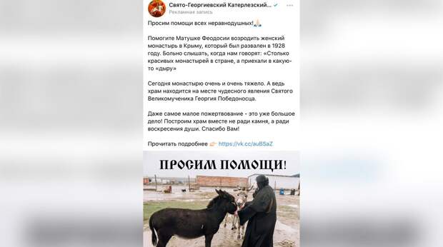 Обладатели собственной странички во «ВКонтакте» могли обратить внимание на призыв о помощи, который время от времени появляется при прокручивании новостной ленты. В обращении говорится о некой матушке Феодосии, возрождающей Свято-Георгиевский Катерлезский женский монастырь в Крыму, где когда-то произошло чудесное явление Георгия Победоносца. Первая реакция — это, конечно, удивление: откуда у скромной обители столько средств, чтобы привлекать к себе внимание через популярную соцсеть? Однако никакого подвоха: храм действительно существует и ему нужна поддержка. Еще шесть лет назад здесь были руины, а теперь раздаются человеческие голоса.