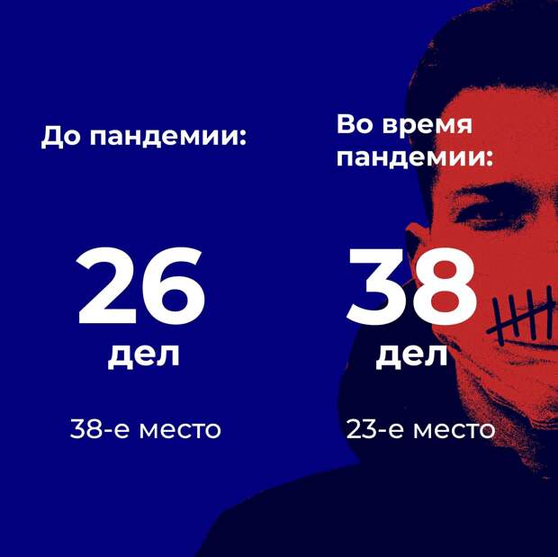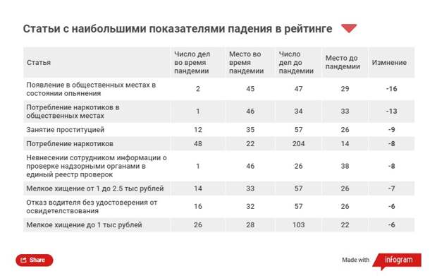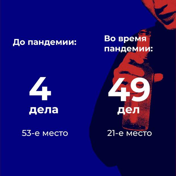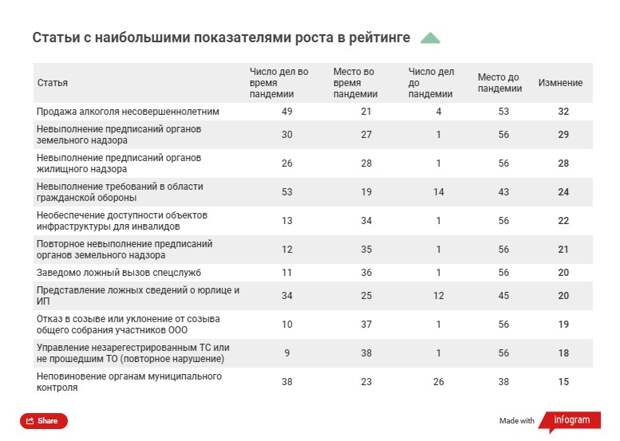 По итогам февраля-марта статья «Неповиновение органам муниципального контроля» заняла 38-ю строчку среди самых распространенных правонарушений. По ней суды вынесли 26 постановлений о привлечении к ответственности. Во время пандемии их число увеличилось до 38. Сейчас статья занимает 23-е место в рейтинге.