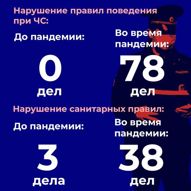 Число штрафов за неповиновение полиции в период пандемии значительно выросло по сравнению с двумя месяцами «мирного времени»: 264 дела против 188.
