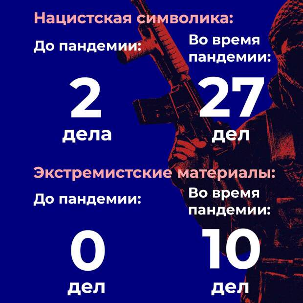 В период карантина неожиданно «выстрелила» вверх статья о пропаганде и демонстрации нацистской символики: 27 административных наказаний в период пандемии против двух в «мирное время». Распределение дел традиционное: большинство протоколов было составлено до начала всеобщей самоизоляции, но именно в апреле-мае они попали в суд.